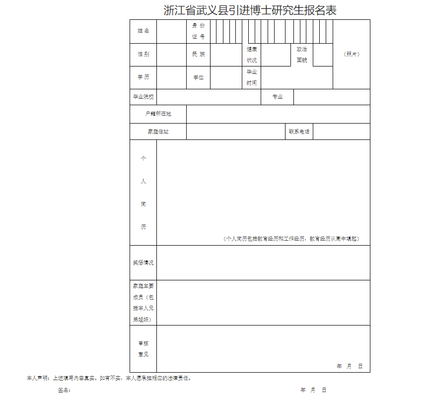 报名方式:下载填写《武义县引进博士研究生报名表》(详见附件),并提供身份证以及证明本人能力水平、业绩阅历等相关个人材料(如毕业证、学位证、获奖证书、资格证书等)扫描件,发送至jhwyzcj@163.com邮箱;邮件名称严格按照“姓名+毕业学校+学历”命名,如“张某+**大学+博士研究生”。