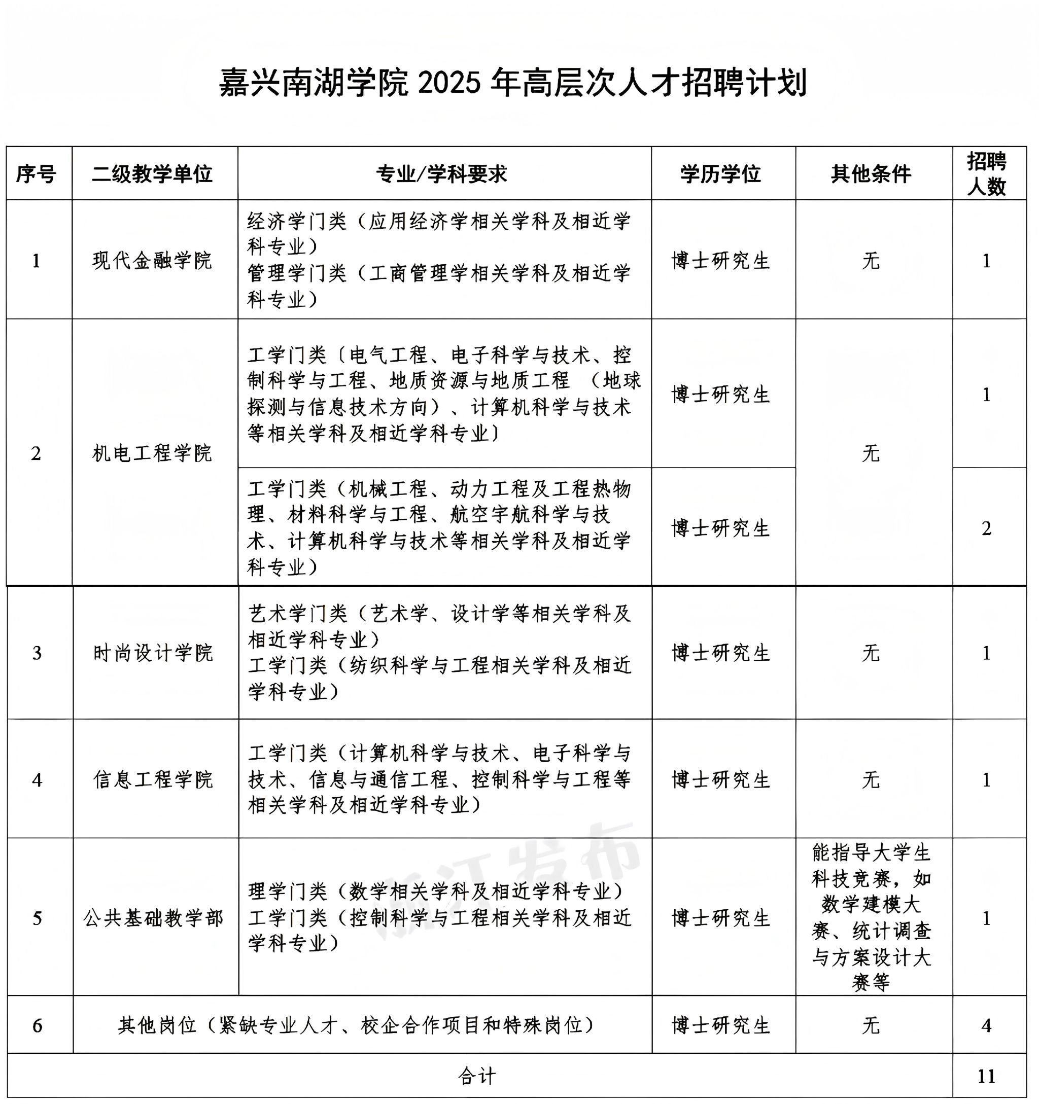 本次招聘高层次人才11名。