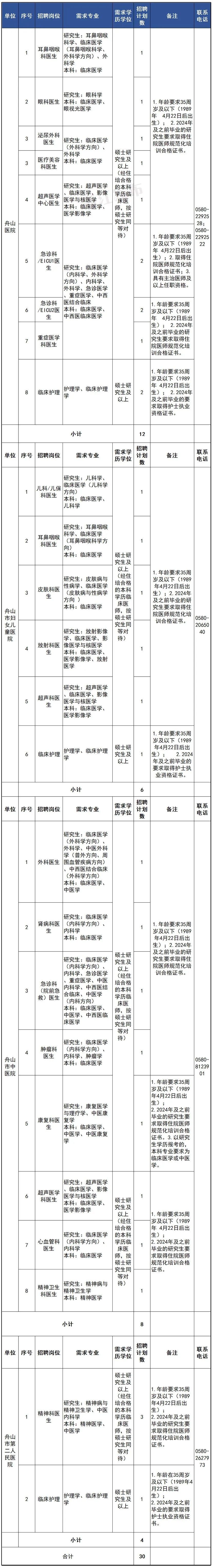 本次舟山市卫生健康委员会部分直属事业单位以“市编省招”方式招聘卫生专业紧缺人才共30名。