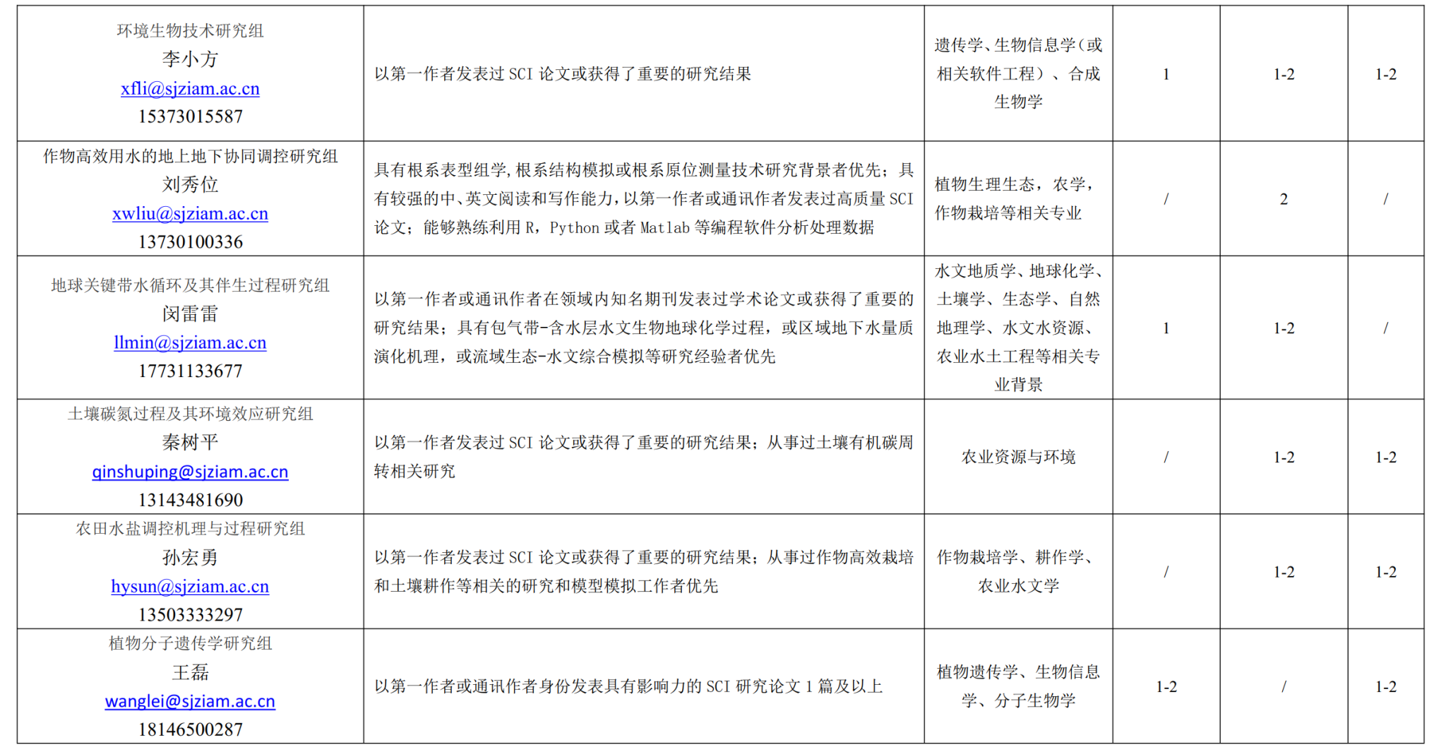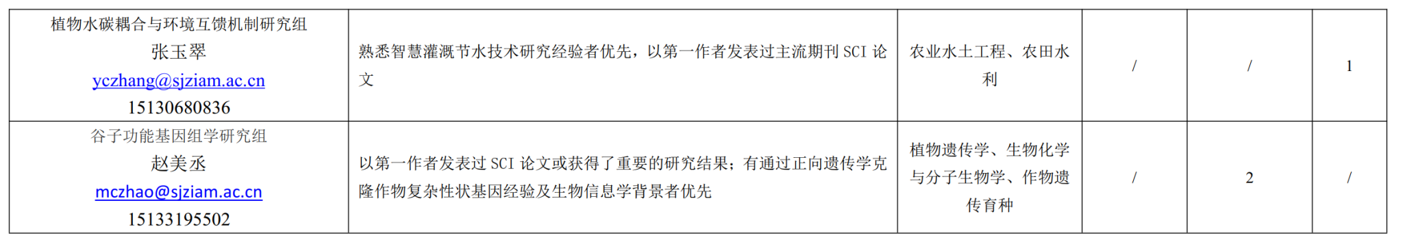 2. 提交方式: 发送电子邮件至附表中的联系人和 zhaopin@sjziam.ac.cn, 邮件主题和文件名为: 招聘岗位联系人姓名-申请岗位类别-申请者姓名。