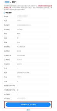 首次登录要核对本人基本信息是否正确。若信息无误,点击“信息确认无误,进入系统”;若信息有误,联系学校就业部门更正(手机号码、电子邮箱需由本人在学信网账号信息中修改)。请务必仔细核对基本信息,否则会影响后续签约、转档、落户。