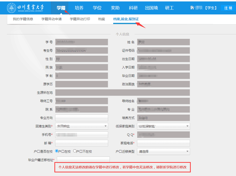 1、个人信息:无法直接修改,在“我的学籍信息”相应栏目修改保存后即可同步修改。