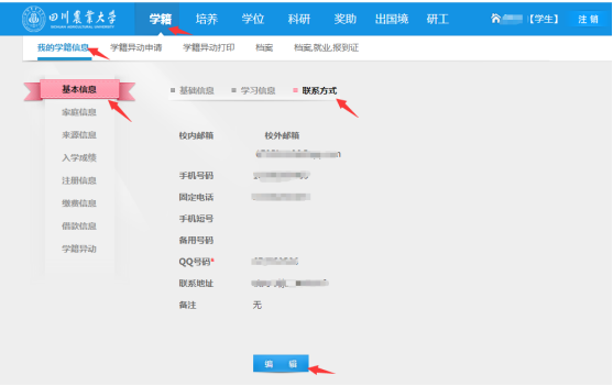 1、进入“学籍”-“我的学籍信息”-“基本信息”-“联系方式”页面,点击“编辑”键。
