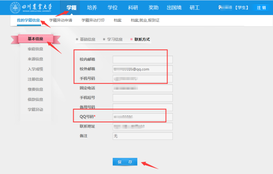 2、进入可编辑状态后,将邮箱、手机号码、QQ号码补充完善后点保存即可生效。校内或校外邮箱均可。