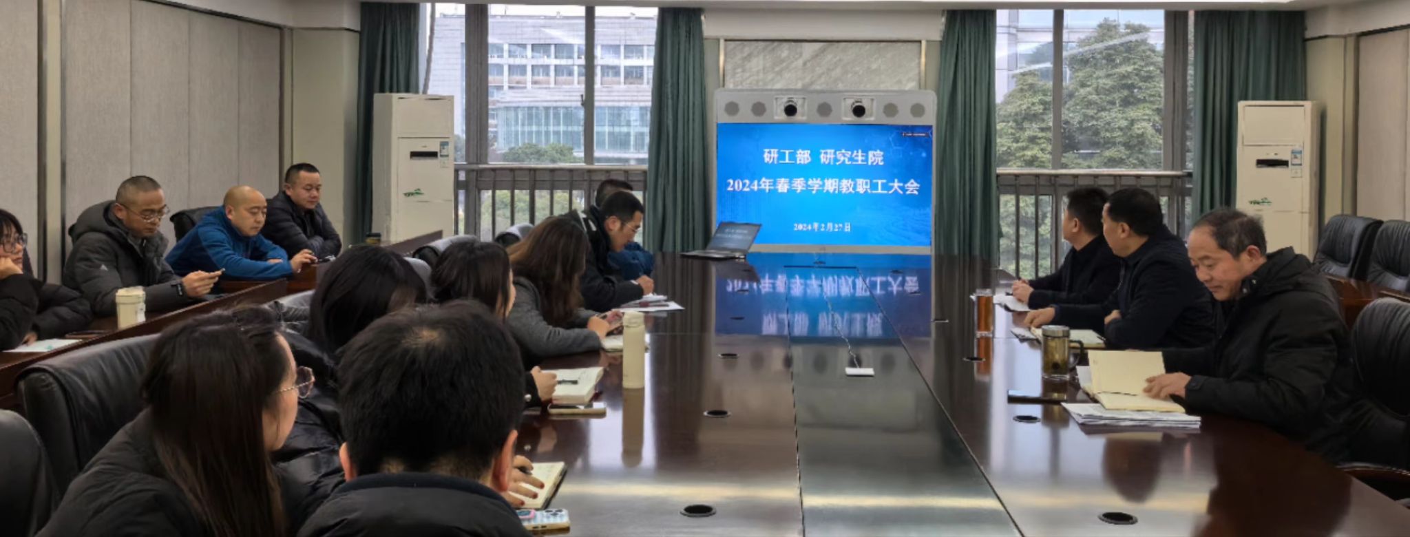 2月27日下午,研工部、研究生院在1教303会议室召开全体教职工大会,深入学习贯彻习近平总书记近期重要讲话精神以及省委近期重要会议和文件精神,传达学习党委中心组(扩大)暨中层领导干部会议精神,结合学校2024年工作要点,谋划部署本学期研究生院重点工作。会议由研究生院院长李廷轩主持。