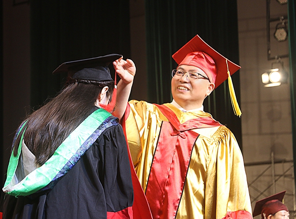在欢快的音乐声中,吴德为博士学位获得者一一拨穗授位。校领导和校学位委员会办公室负责同志为全体硕士学位获得者依次拨穗授位。